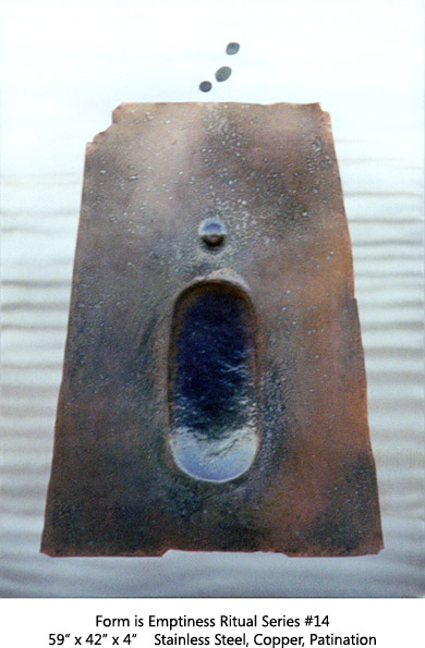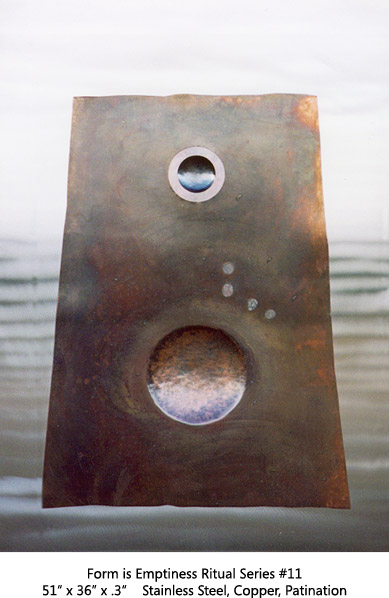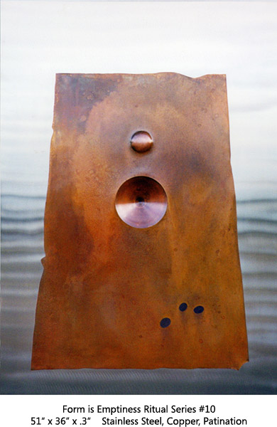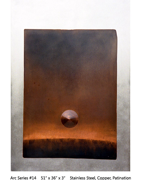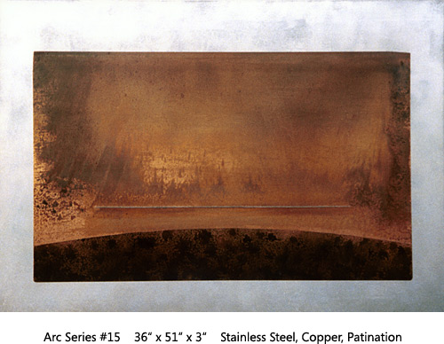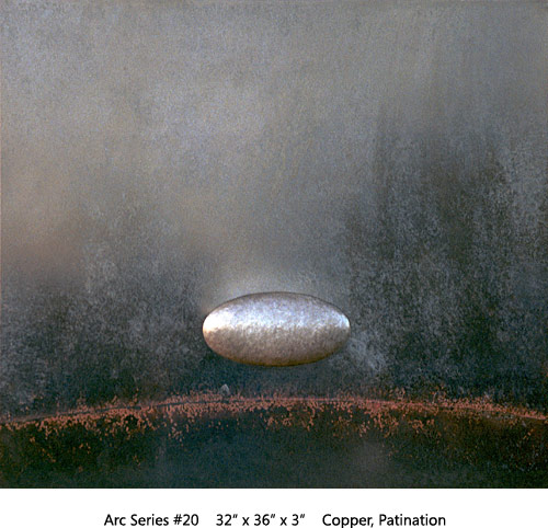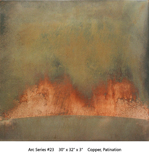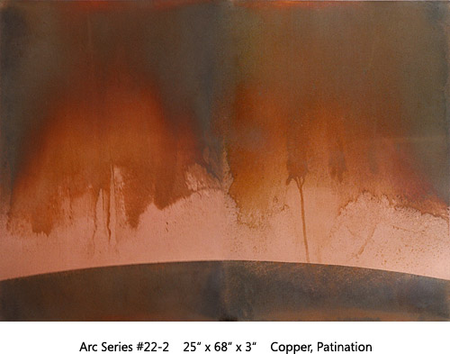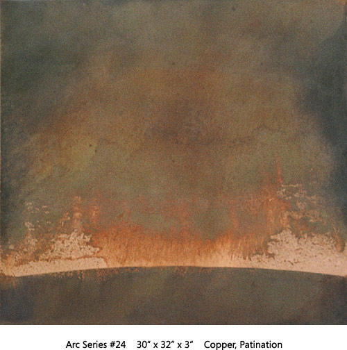 The Arc Series has to do with Earth, Space, Light, Atmosphere. Moving through varied permutations of a fixed theme allows for focused realizations. This two-panel all copper Arc is the most recent of the series.