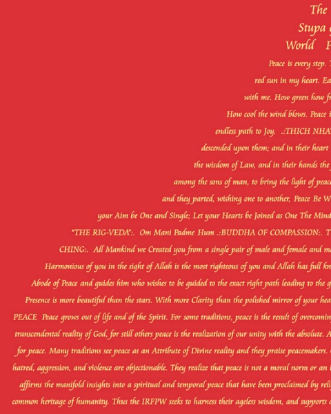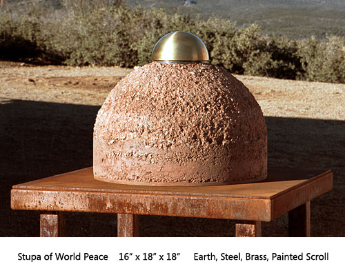 Stupa of World Peace is a laymen’s monument that I have dedicated to world peace. It contains within its earthen body a metal chamber in which is placed a repetitive scroll. This scroll is a compilation of old and new prayers, vows, poems, and aspirations for peace. It is printed on continuous roll of paper upon which the entire compilation repeats every 22 inches. This work is in response to the recent events in the world and my own recognition of the significance of inner and outer peace. It is my intention to continue this series of transportable sculptures, as well as larger “site built” works of various shapes and configurations dedicated to select themes and purposes.