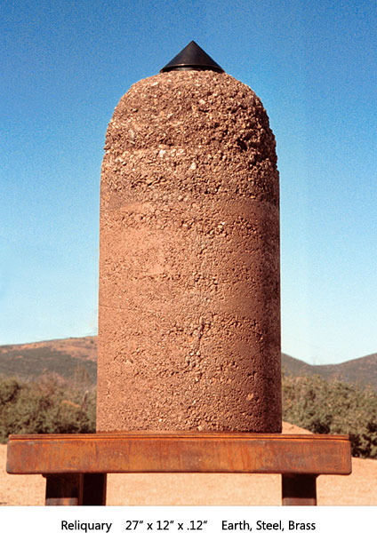 I have always been drawn, in a complete all encompassing way, to earth monuments of the past: tumuli, mounds, megalithic arrangements of stones, pyramids and towers. Some function as geodetic markers indicating place on earth, some as astronomical observatories studying position and pattern in the Universe. Some have evolved to become altars, shrines, and temples. They have become or always were our sacred buildings. One expression of such a building is the Buddhist Stupa. Stupas are powerful textural conditions of structure, space, color, light, and form. They are buildings of content and intention, symbols of knowledge, statements of truth and understanding. Stupas are known to inspire people, energize land, remove obstacles and promote peace and compassion. Designed and built according to ceremonial order, many Stupas contain relics and written prayers. My study of Stupas and my own experience building with earth has led me as a sculptor to begin my present exploration of reliquaries and a laymen’s form of Stupa.