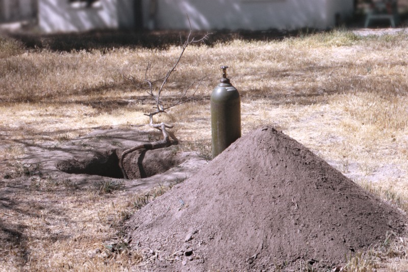 an emerging tree branch was placed into the hole extending upwards along the ground. A large oxygen cylinder was buried